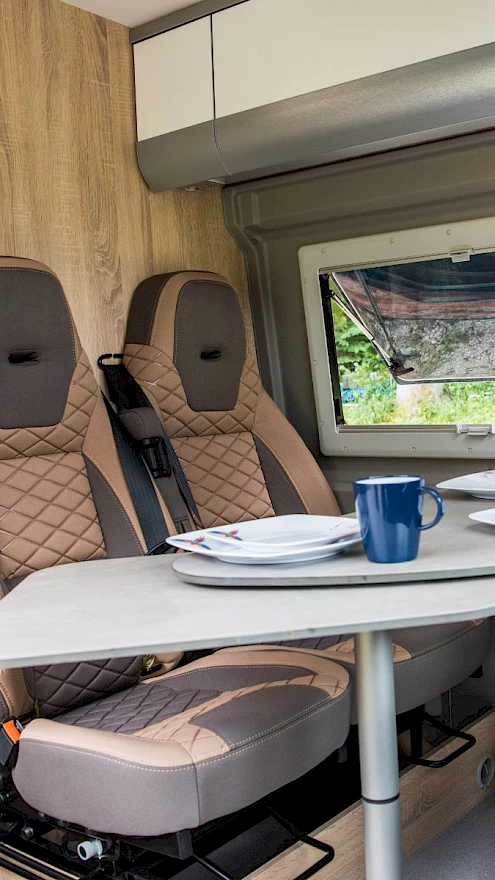 Der CLEVER VANS Celebration überzeugt aufgrund seiner Länge von 6m und der optimierten Raumgestaltung, welche dank dem Querbett hinten und dem erhöhtem Kühlschrank für genügend Stauraum und Platzangebot bei der Dinette sorgt.