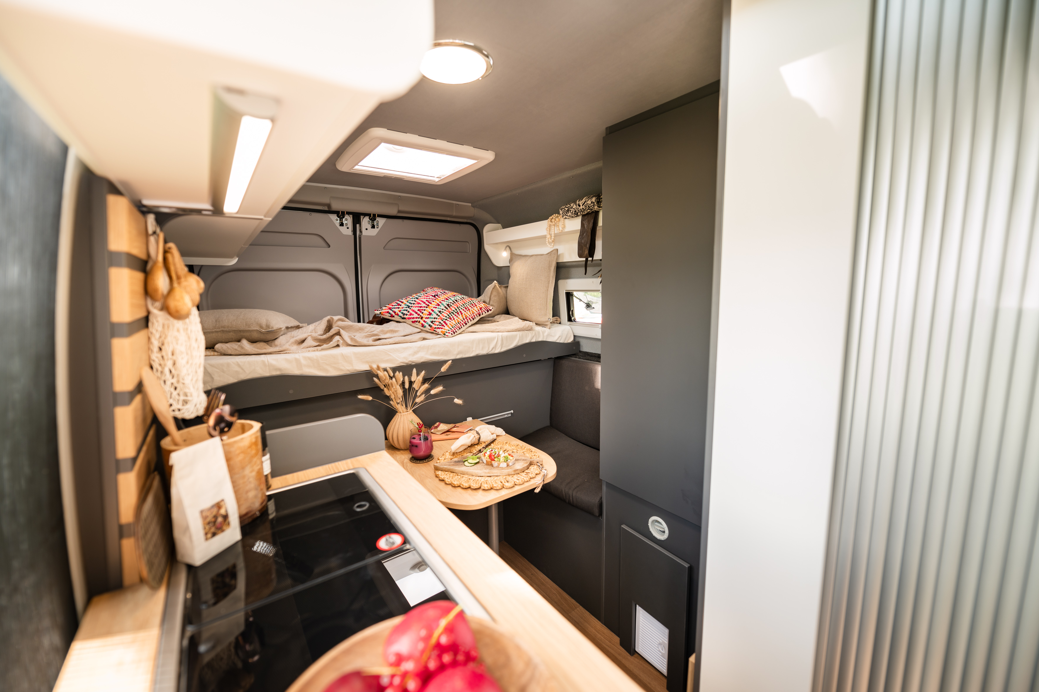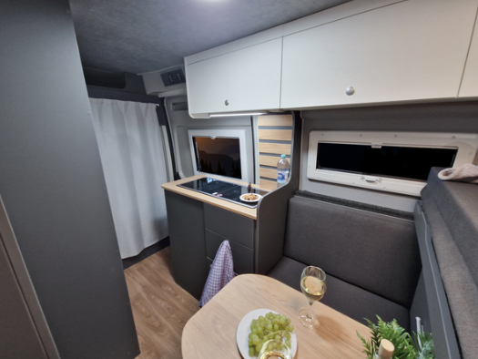 Dank einem verstellbaren Doppel-Bett ist tagsüber Platz, für eine klassische Dinette, im Wohnbereich.