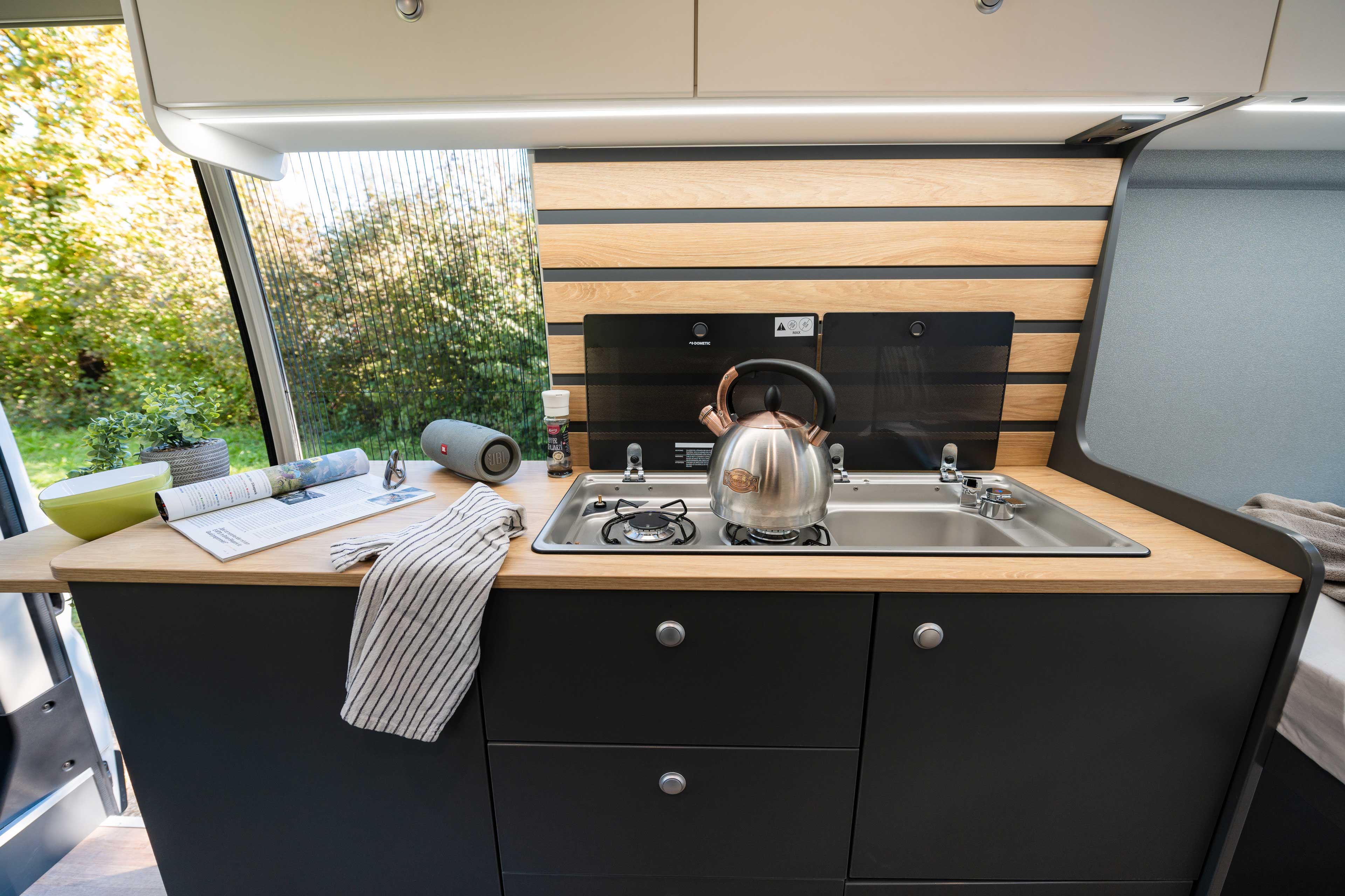 Für ein tolles Raumgefühl sorgt der neu designte Küchenblock mit durchgehender Sichtachse, der selbst unser kompaktes Modell mit einem großartigen Raumgefühl.