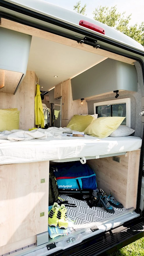 Der CLEVER VANS Celebration überzeugt aufgrund seiner Länge von 6m und der optimierten Raumgestaltung, welche dank dem Querbett hinten und dem erhöhtem Kühlschrank für genügend Stauraum und Platzangebot bei der Dinette sorgt.