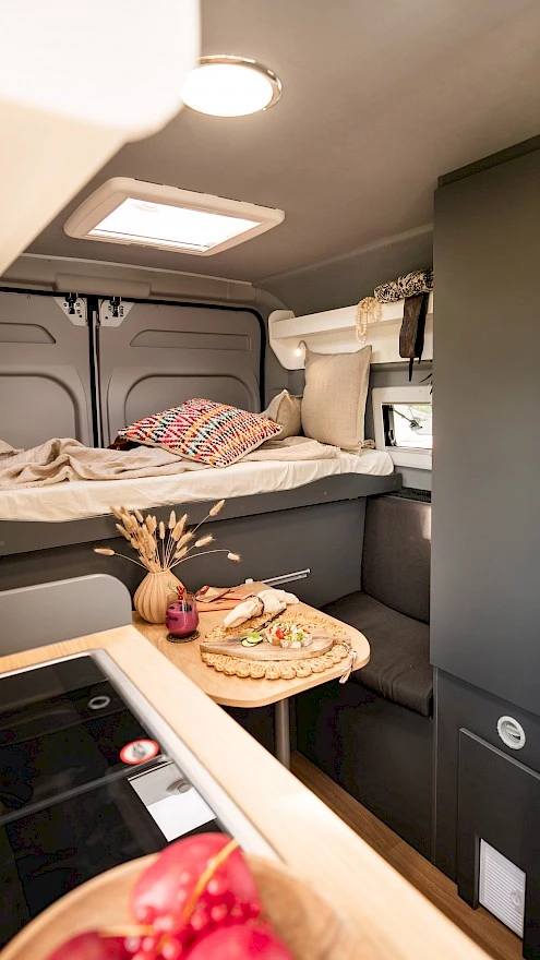 Dank einem verstellbaren Doppel-Bett ist tagsüber Platz, für eine klassische Dinette, im Wohnbereich.