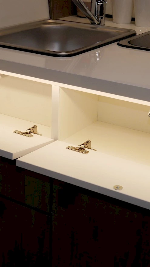 Die geschmackvolle Ausstattung findet man hier bis in den letzten Winkel des Fahrzeuges, so ist eine indirekte Beleuchtung und weiters zwei Lautsprecher hinten beim Bett verbaut.