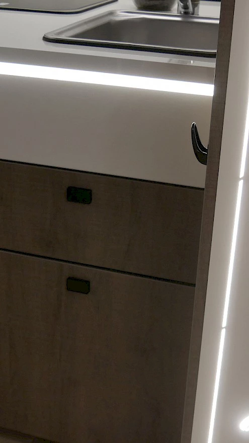 Der Schlafraum hinten lässt sich durch eine Schiebetür abtrennen, somit ist ein Fernsehabend vorne jederzeit möglich.